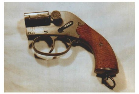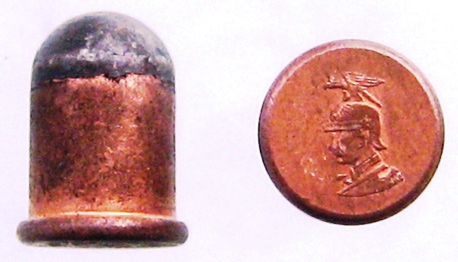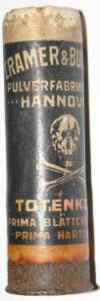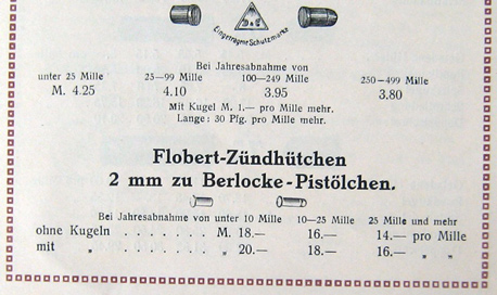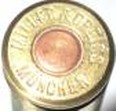 Diese 9 mm Bosquette (auch als Doppelflobert bezeichnet), wurde von RWS in Stadeln vor dem 1. Wk hergestellt. Die Hand mit dem Dolch war das Warenzeichen der Firma Mayntzhusen & Hiller, Hamburg Alsterdamm 7. Die Anmeldung erfolgte 1906, die Eintragung 1908. Die Patronen wurden exportiert, hauptsächlich nach Südamerika.