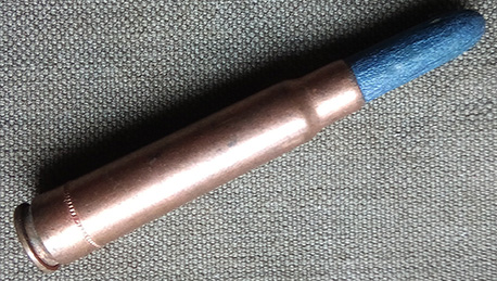 Platzpatrone 7,9 mm mit blauem Holzgeschoss für MG von Juli 1917 (Hülsenlieferung), Einheitshülse Stahl verkupfert, Hersteller PMF.