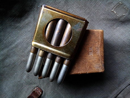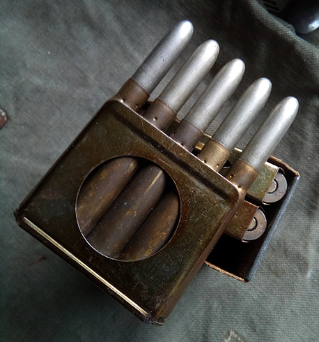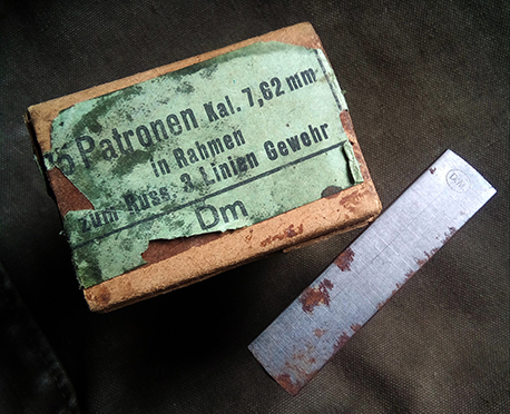 Die Firma DWM in Karlsruhe bekam deshalb den Auftrag, nicht nur die entsprechende Munition für diese Dreiliniengewehre, sondern auch die Laderahmen für sie herzustellen, die man auf den Bildern der Schachtel samt ihrem Inhalt sieht.
