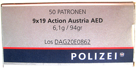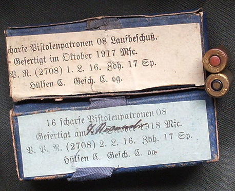 Wie man anhand einer Referenzschachtel ganz normaler 08 Patronen aus dem gleichen Hause (Cassel) sieht, unterscheiden sich die Patronen äußerlich nur durch das rot lackierte Zündhütchen von denen der normalen Munition, die mit schwarzer Ringfugenlackierung hergestellt wurde.