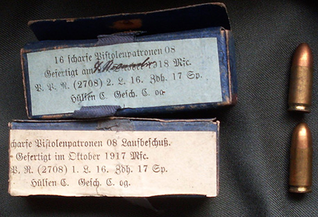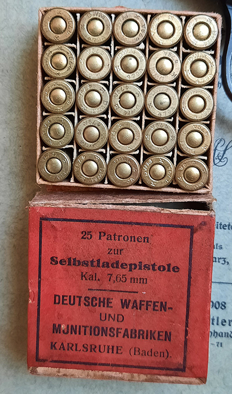 Es handelt sich um auf dem Markt befindliche Munition Kaliber 7,65 Browning aus der Zeit vor, während und noch kurz nach dem Ersten Weltkrieg,