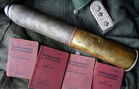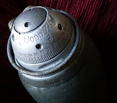 Es handelt sich hier um eine 7,7 cm Sprenggranatpatrone mit Doppelzünder 96 (hier noch mit Vorstecker) für die Feldkanone C/96, für die Feldkanone 96 n.A. und die 7,7 cm Feldkanone 96/15 sowie die 7,7 cm Feldkanone 1916.