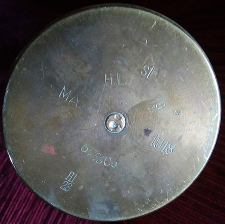 Die Hülse stammt von Mai 1918 und besteht aus einer Legierung von 67 % Kupfer und 33 % Zink.