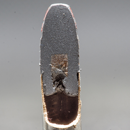 Ein QD - Geschoßschnitt mit einem Zettel der alles sagt was ein Patronensammler wissen möchte.