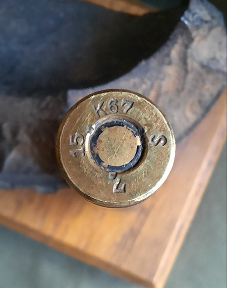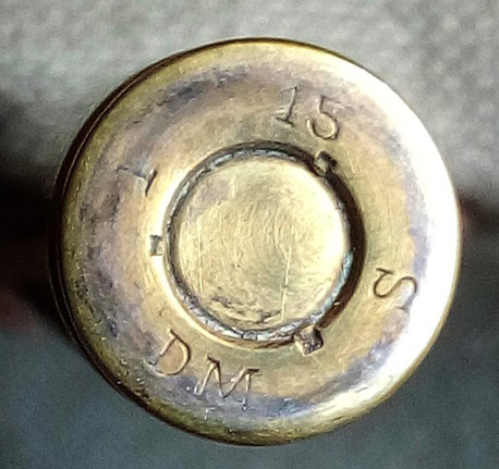 Hersteller der Hülse ist das königliche Arsenal Spandau, Hülsenlos Juli 1915, Hülsenlegierung 67 % Kupfer und 33 % Zink.