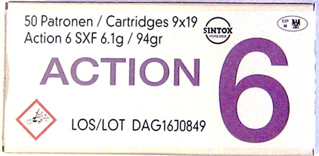 Patrone der Ruag Typ Action 6 mit einer lila Kappe. Dazu die dazu gehördende Schachtel.
