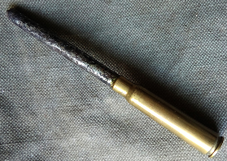 Es handelt sich um eine S Patrone für Schusswaffen 98 in der Ausführung als sogenannte "Drahtschneidepatrone". Sie ist mit einem leicht unterkalibrigen Eisenstab versehen.