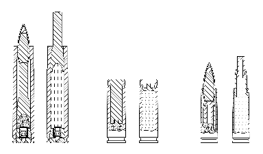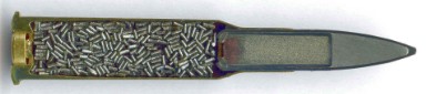 Schnittdarstellung verschiedener Nahpatronen (geladen und abgeschossen) um die Funktionsweise deutlich zu machen. Von links nach rechts: 7,62 mm PZAM, 7,62 mm SP-